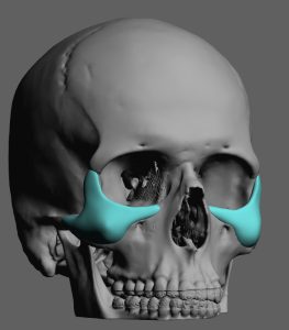 1) When designing a custom skull implant that crosses over the bony temporal line onto the side of the head you have to factor in the thickness of the temporal muscloe which sits on the bone in that area. If not one can inadvertently make the flatter side more full than the protrusive side.