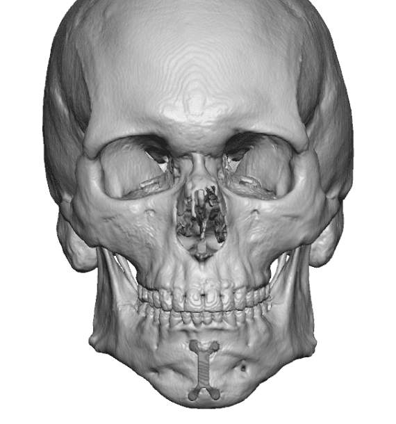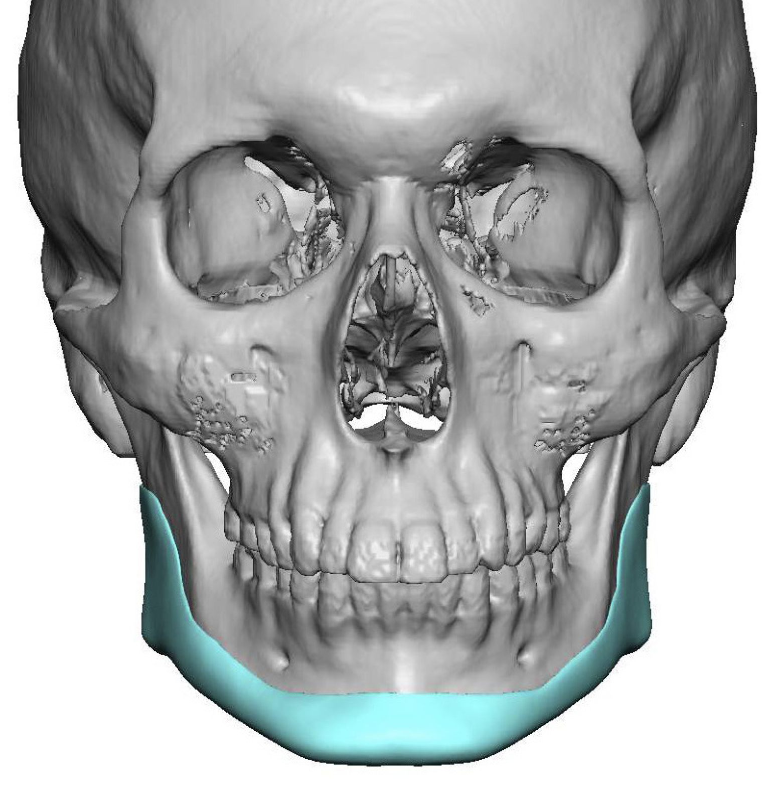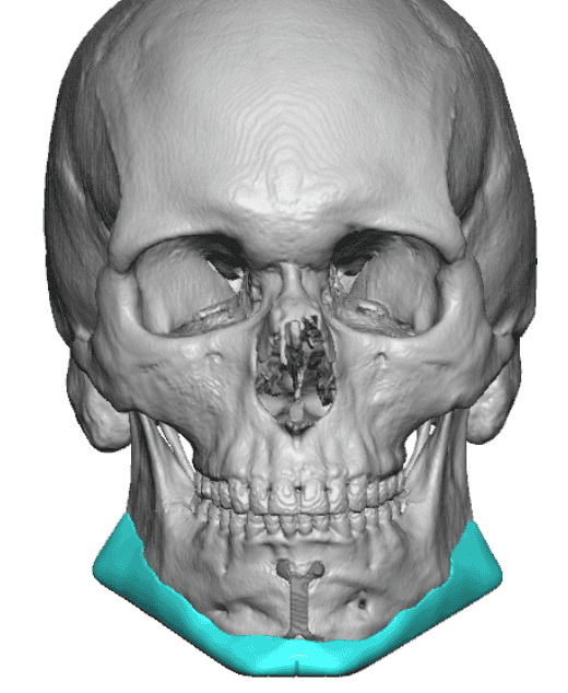 Square custom chin implant perfectly placed and conformed by postop 3D CT scan with left-sided chin asymmetry.