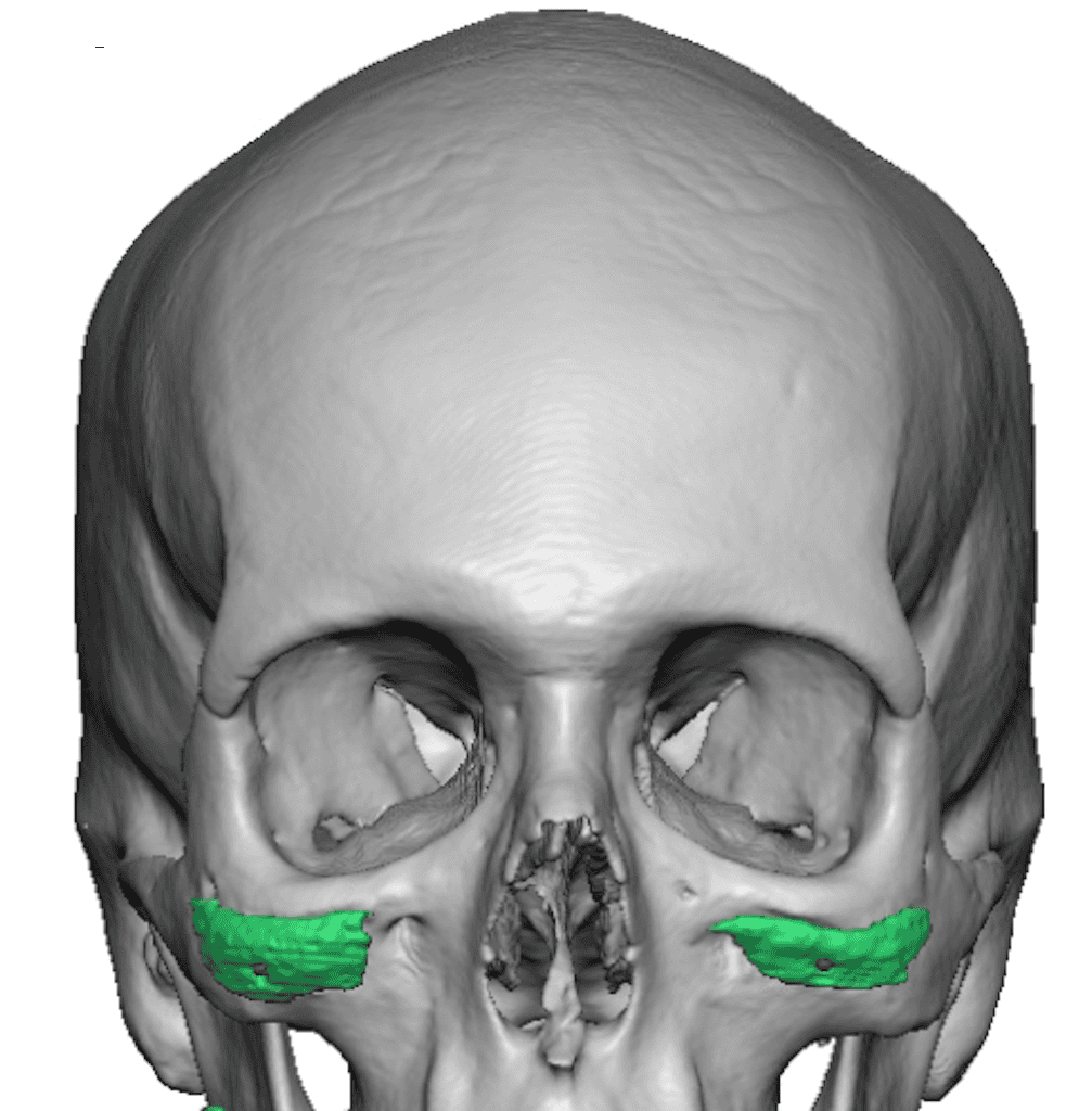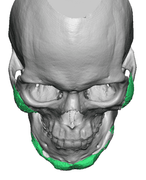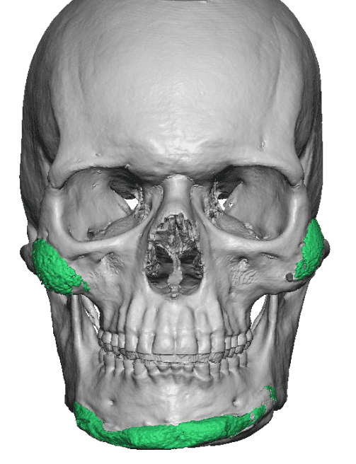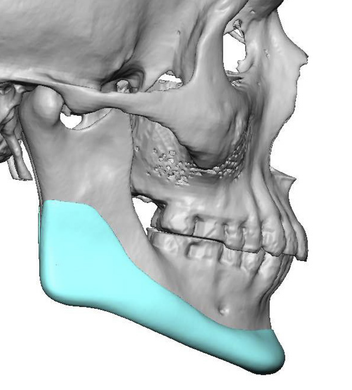 Custom jawline implant placed through three external skin incisions. (submental and posterior jaw angles)