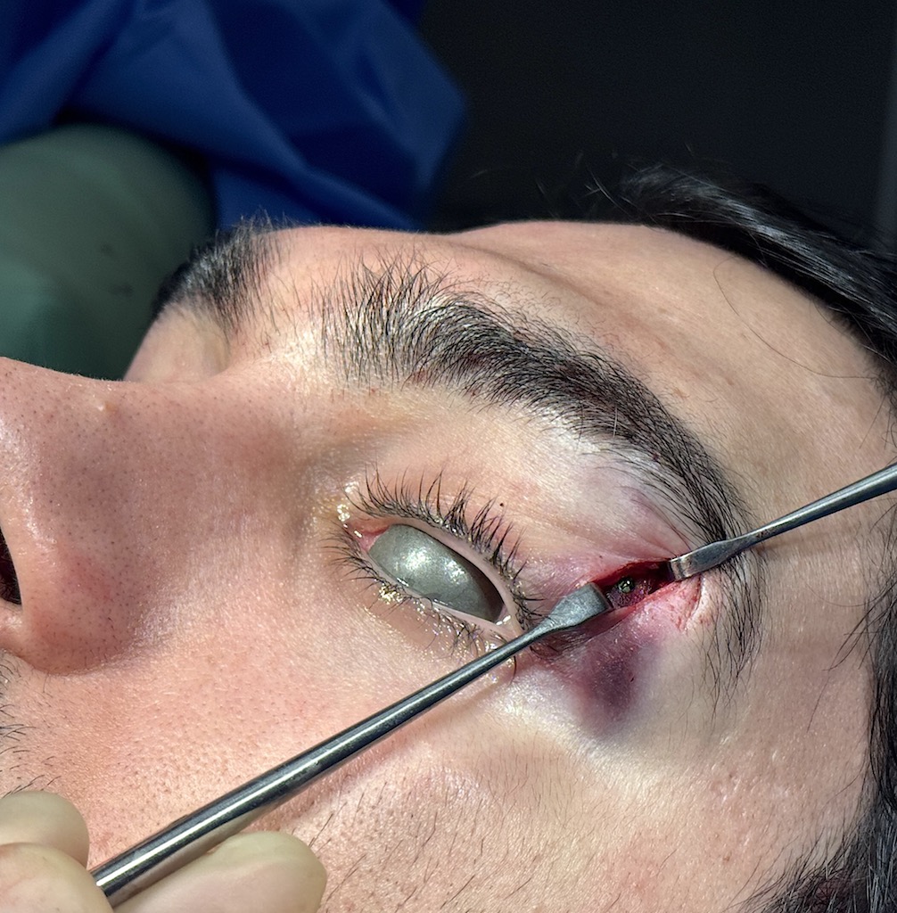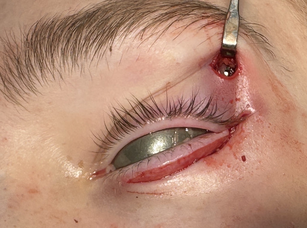 Placement of custom right brow bone implant through an upper eyelid incision.
