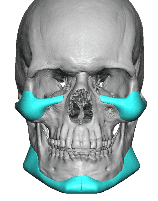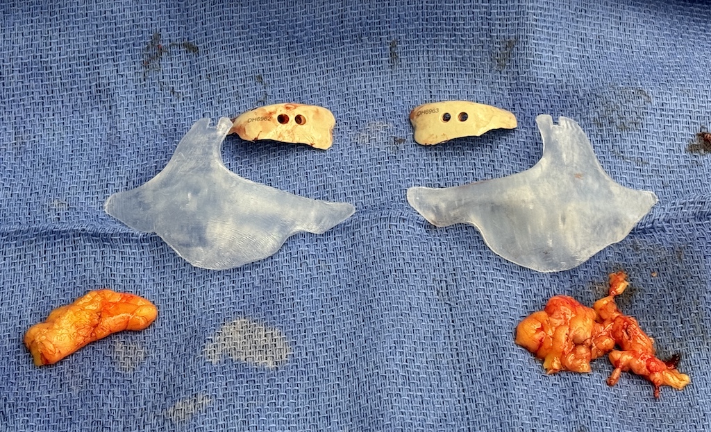 Custom jawline implant placed through three external skin incisions. (submental and posterior jaw angles)