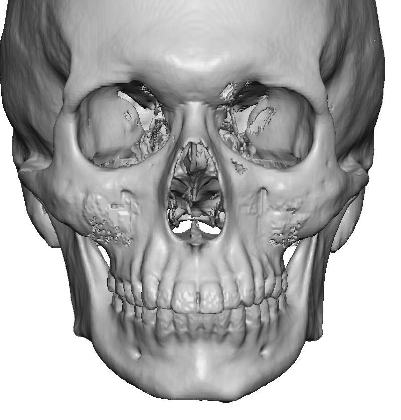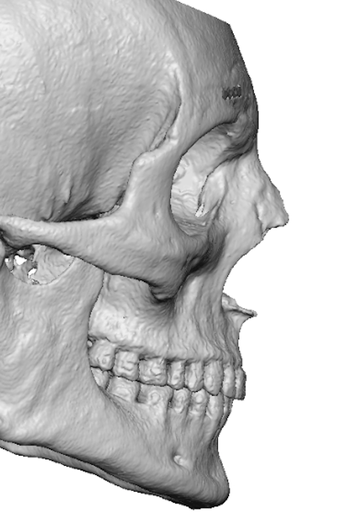 Square custom chin implant perfectly placed and conformed by postop 3D CT scan with left-sided chin asymmetry.