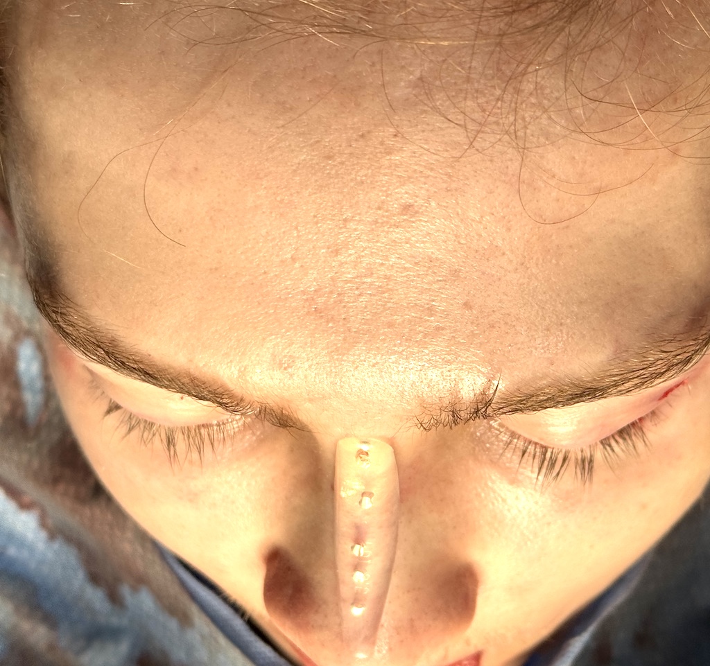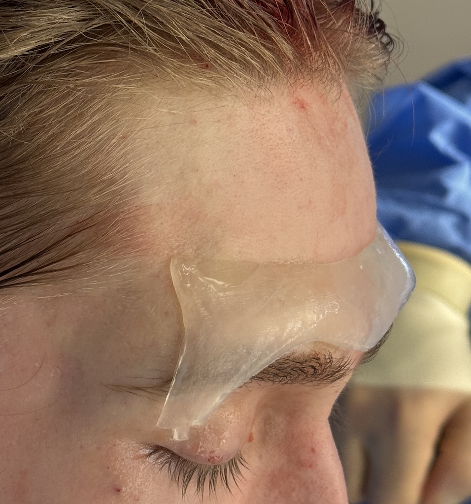 Placement of custom forehead implant to smooth to forehead and reduce the prominence of the brow bone break.