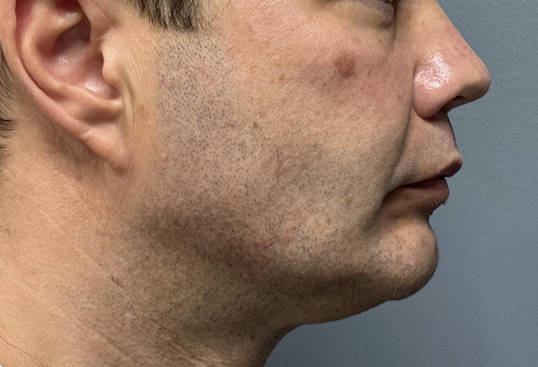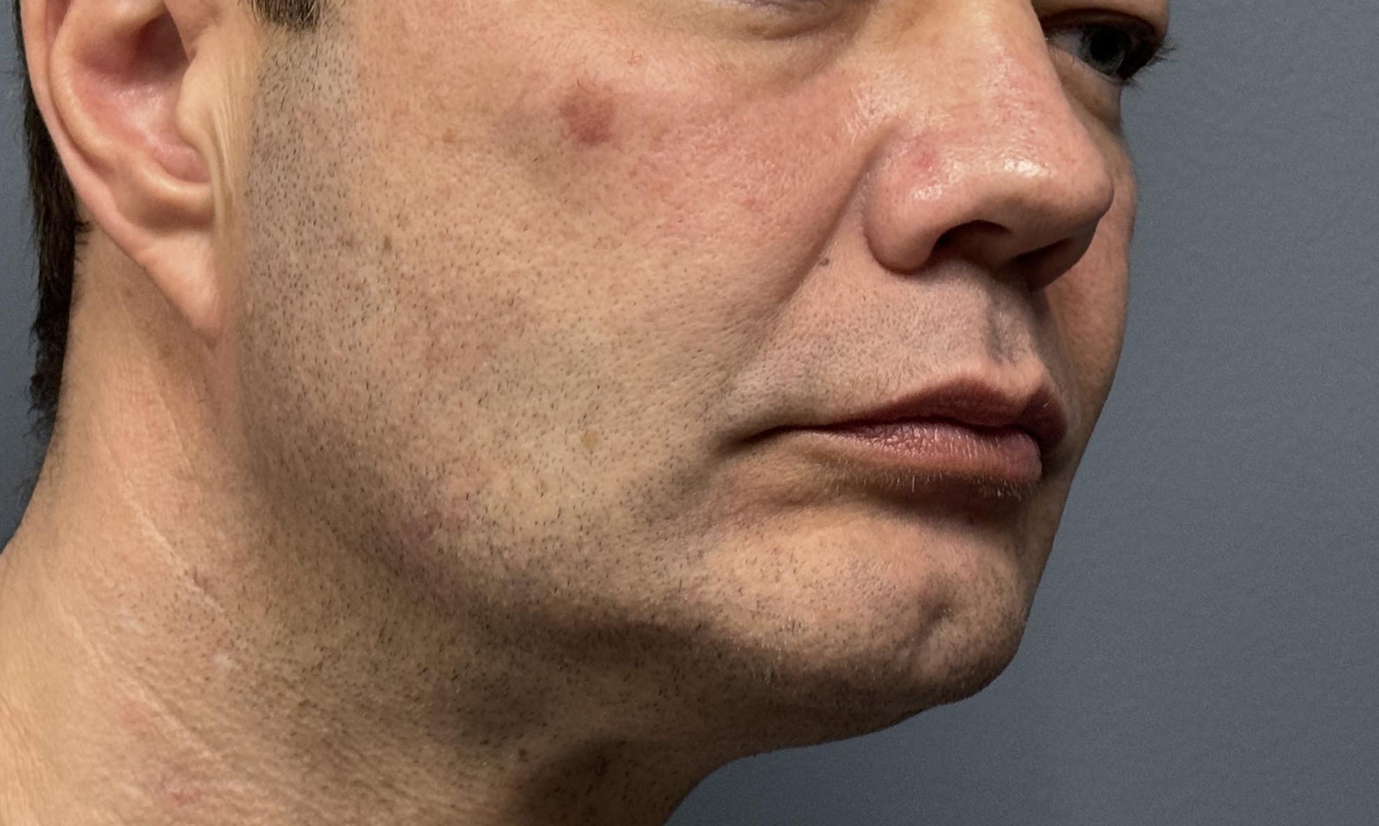 Vertical lengthening custom jawline implant with improved facial proportions, more distinct transition between the face and neck and the elimination of loose jowl and neck skin.