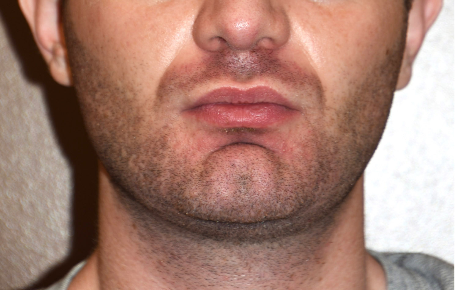 Desire for a more effective jaw augmentation after having an initial chin implant. Middle aged male with thick tissues and some facial soft tissue laxity.
