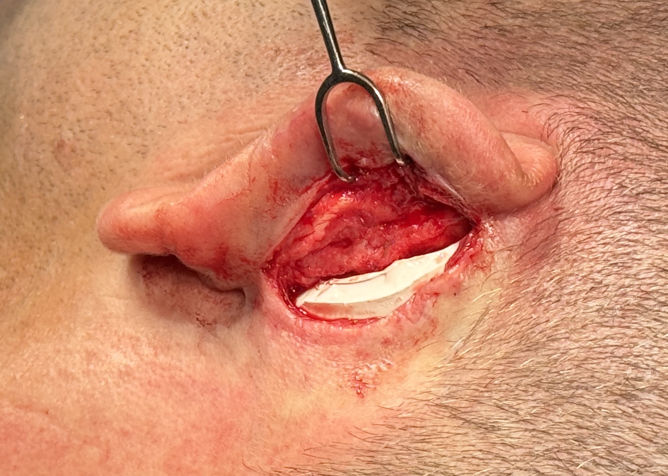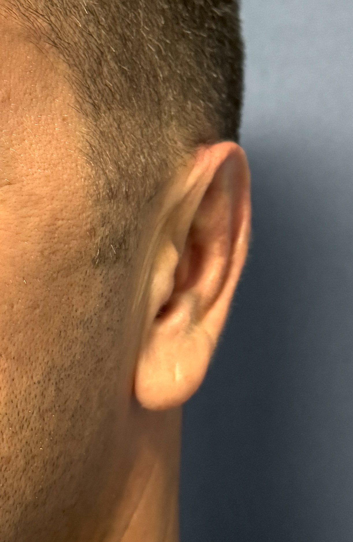 Subtotal otoplasty reversal with cartilage release and placement of ePTFE wedges for his desired increase in ear projection.