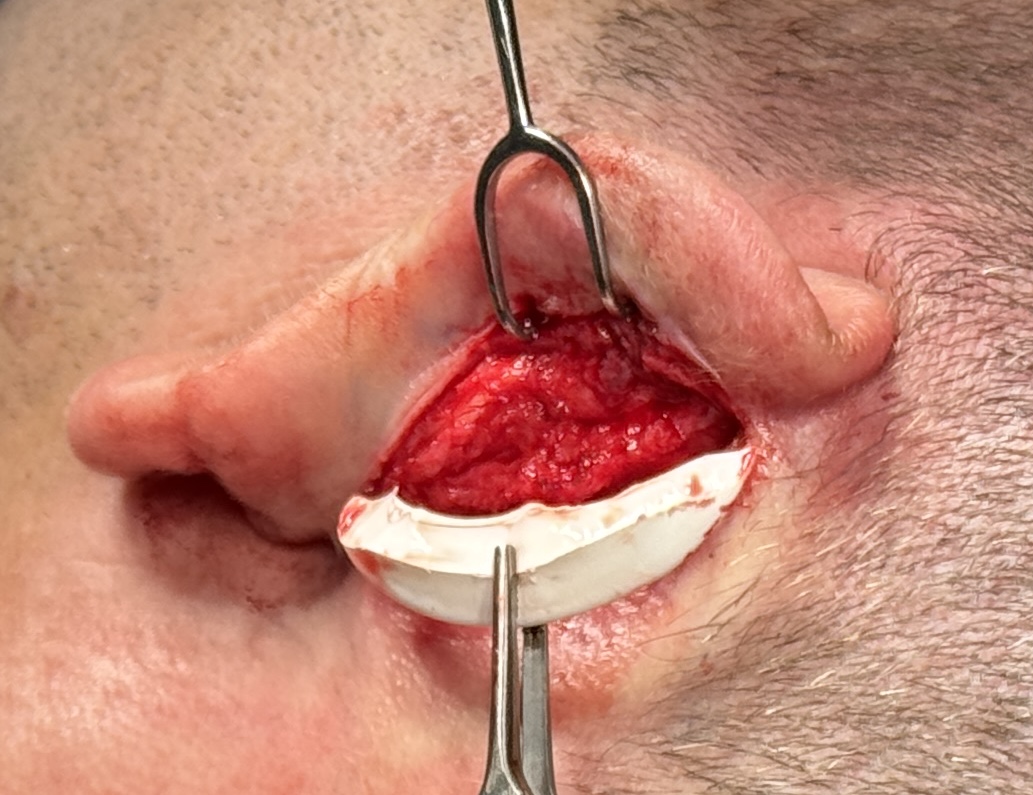 Otoplasty reversal with cartilage release and tissue bank rib graft placement in the middle third of the ear.