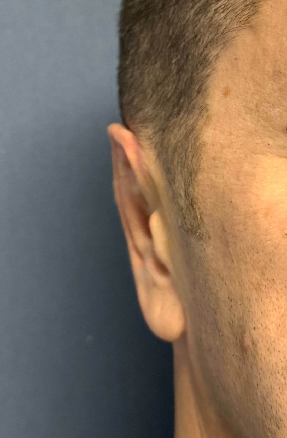 Side view of setback otoplasty result showing the increased antihelical fold of the ear by suture reshaping.