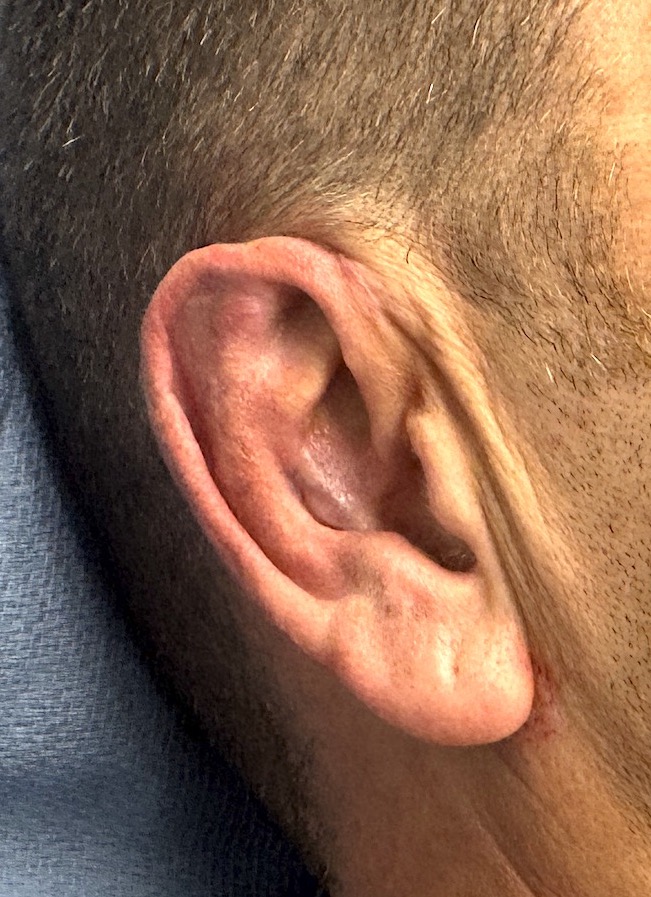 Male who had a setback otoplasty 9 months previously. The center part of his ear was pulled back too far. (loss of helical rim show)