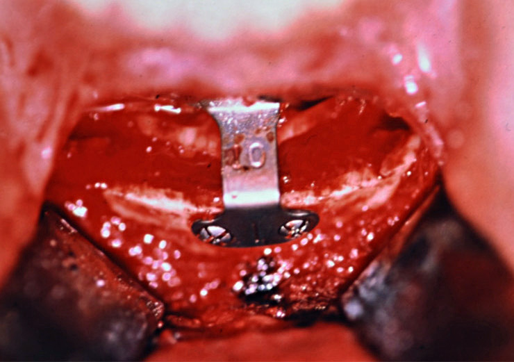 Intraoral opening wedge osteotomy with 10mm dropdown with cadaveric bone chip grafting.