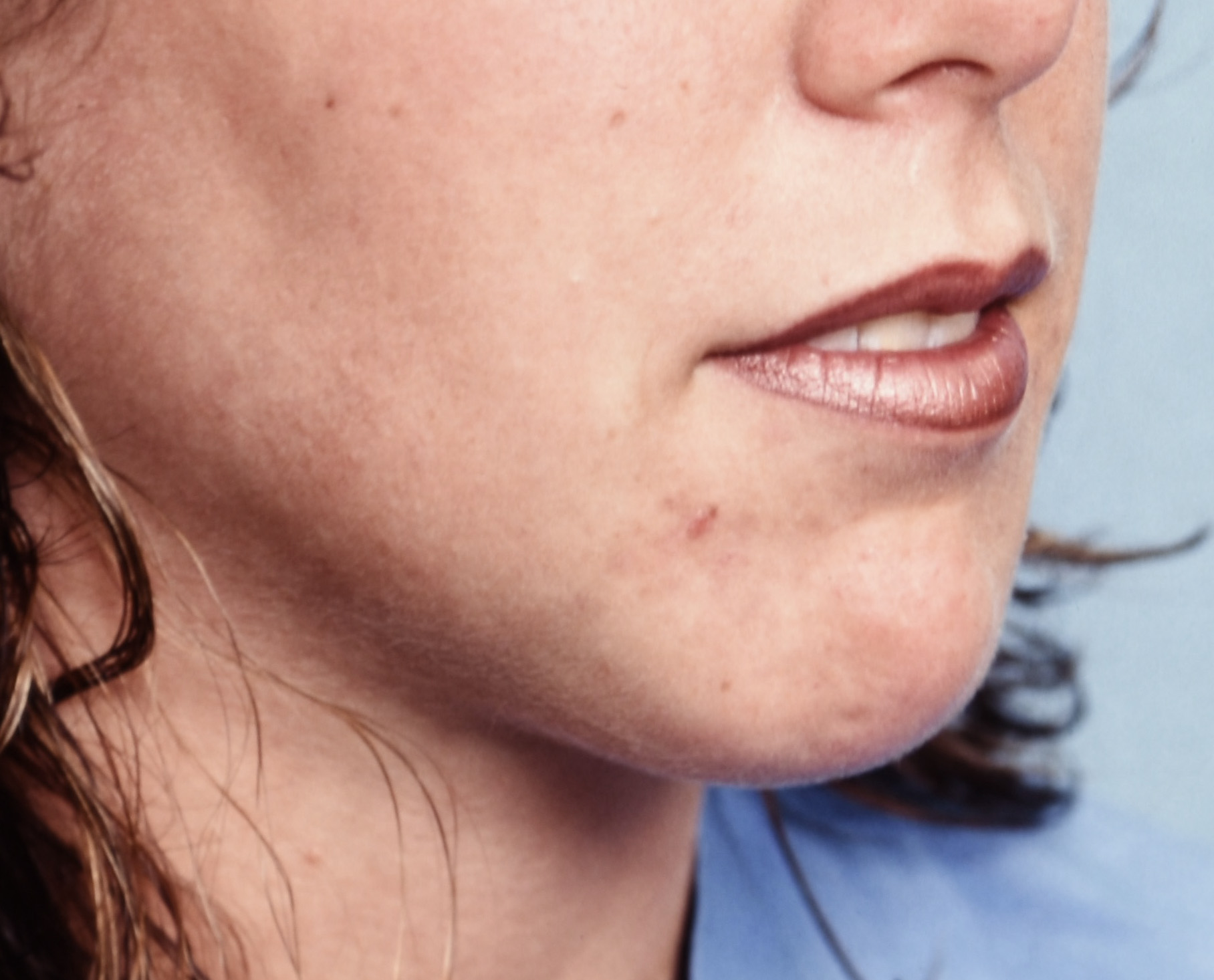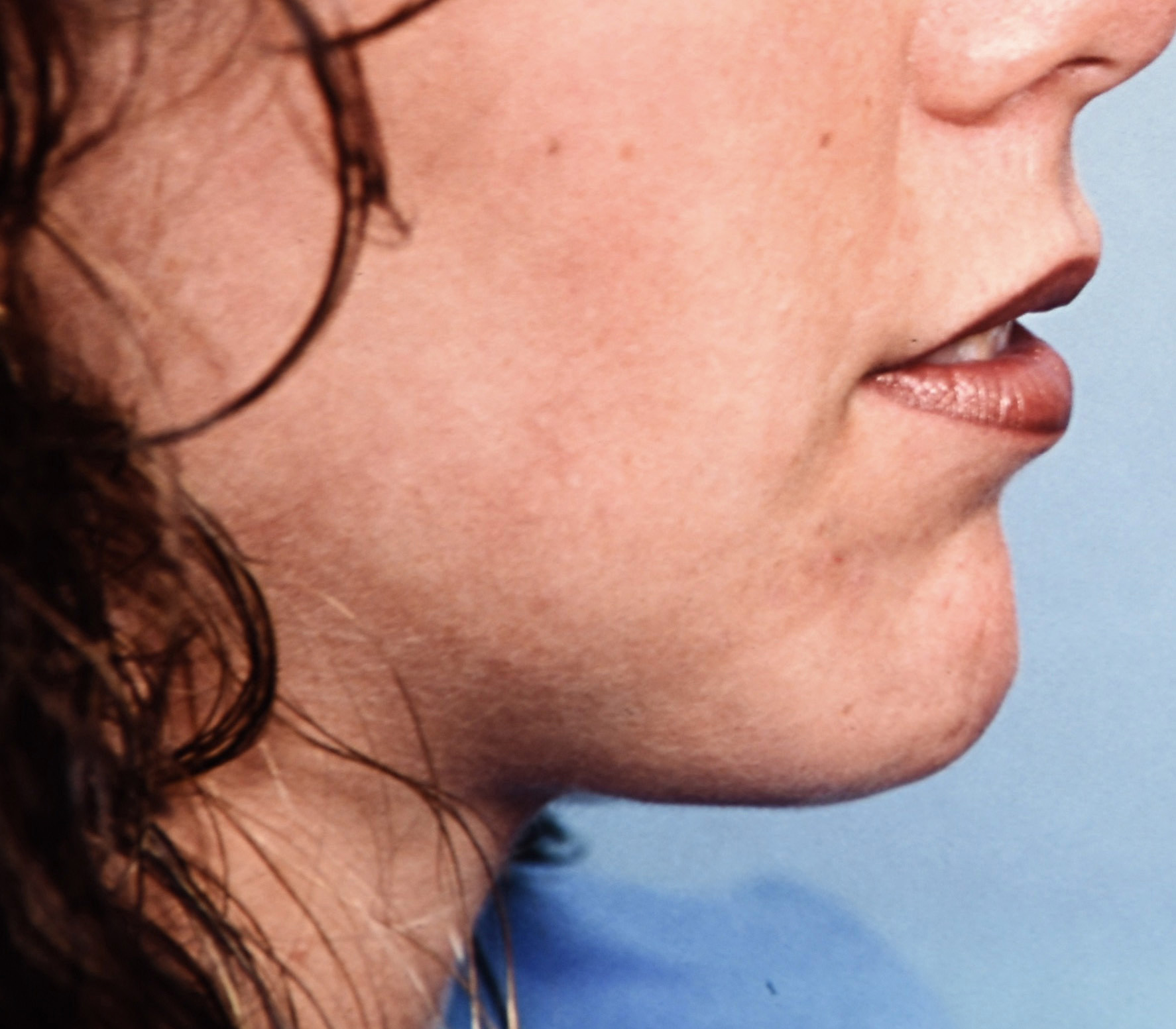 History of chin augmentation using a mersilene mesh chin implant giving her a broad more square-shaped chin.