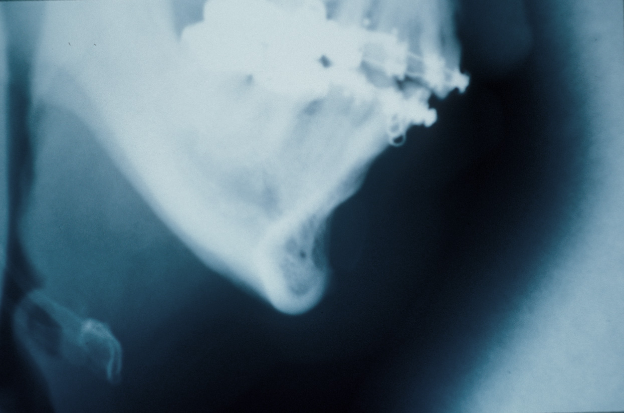 Chin bone asymmetry due to previous symphyseal fracture and repair.