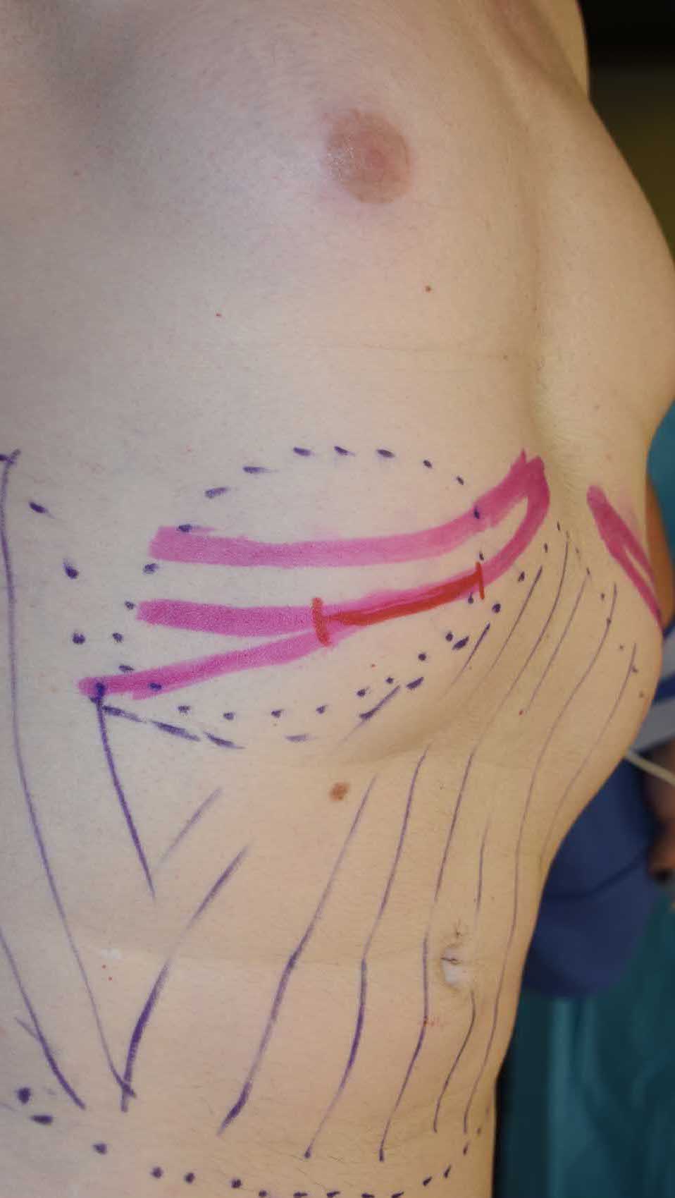 Shaving of left rib #8 to reduce flare through small overlying incision. (Which is marked in red with the purple being the extent of the flare)