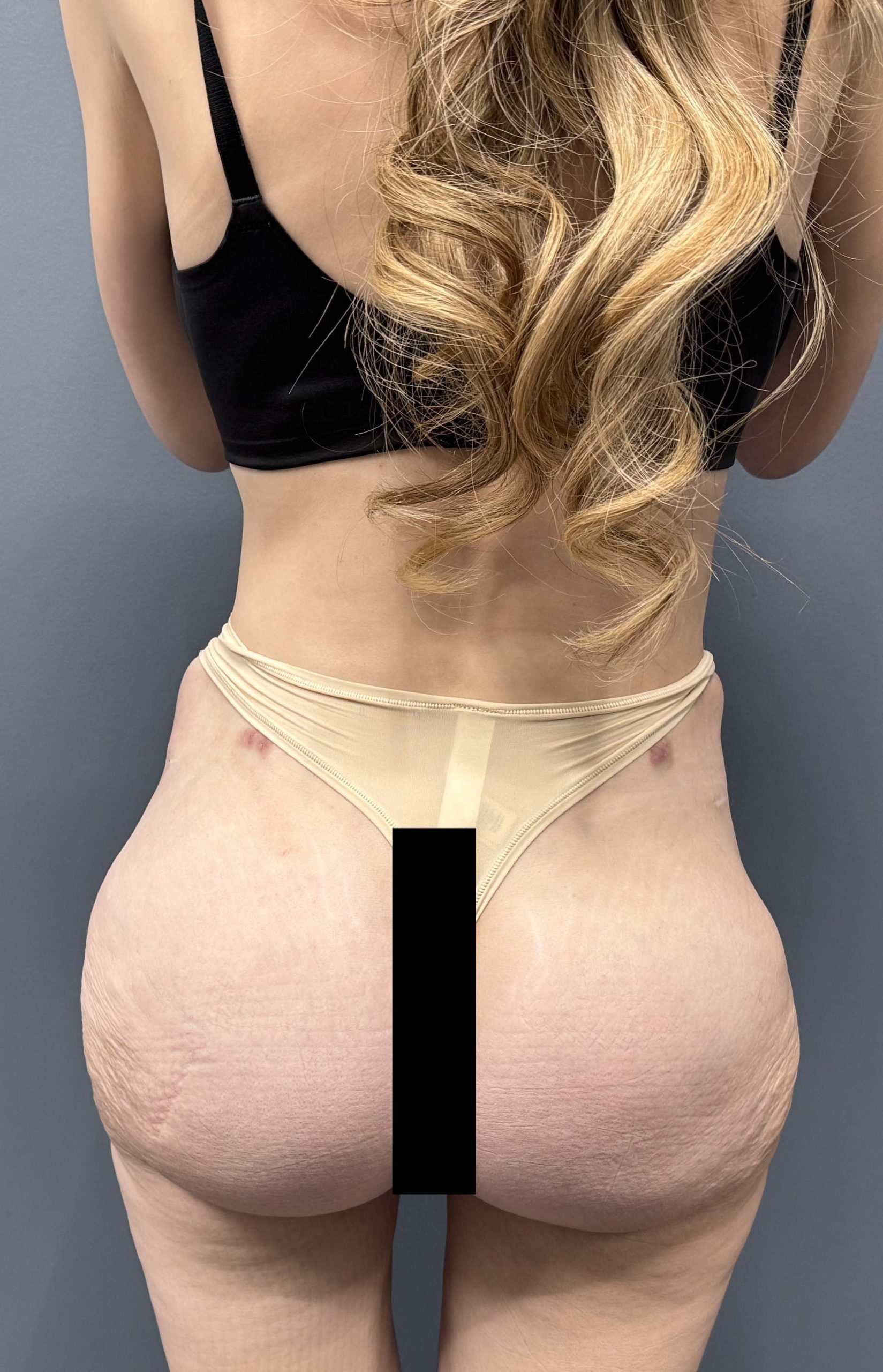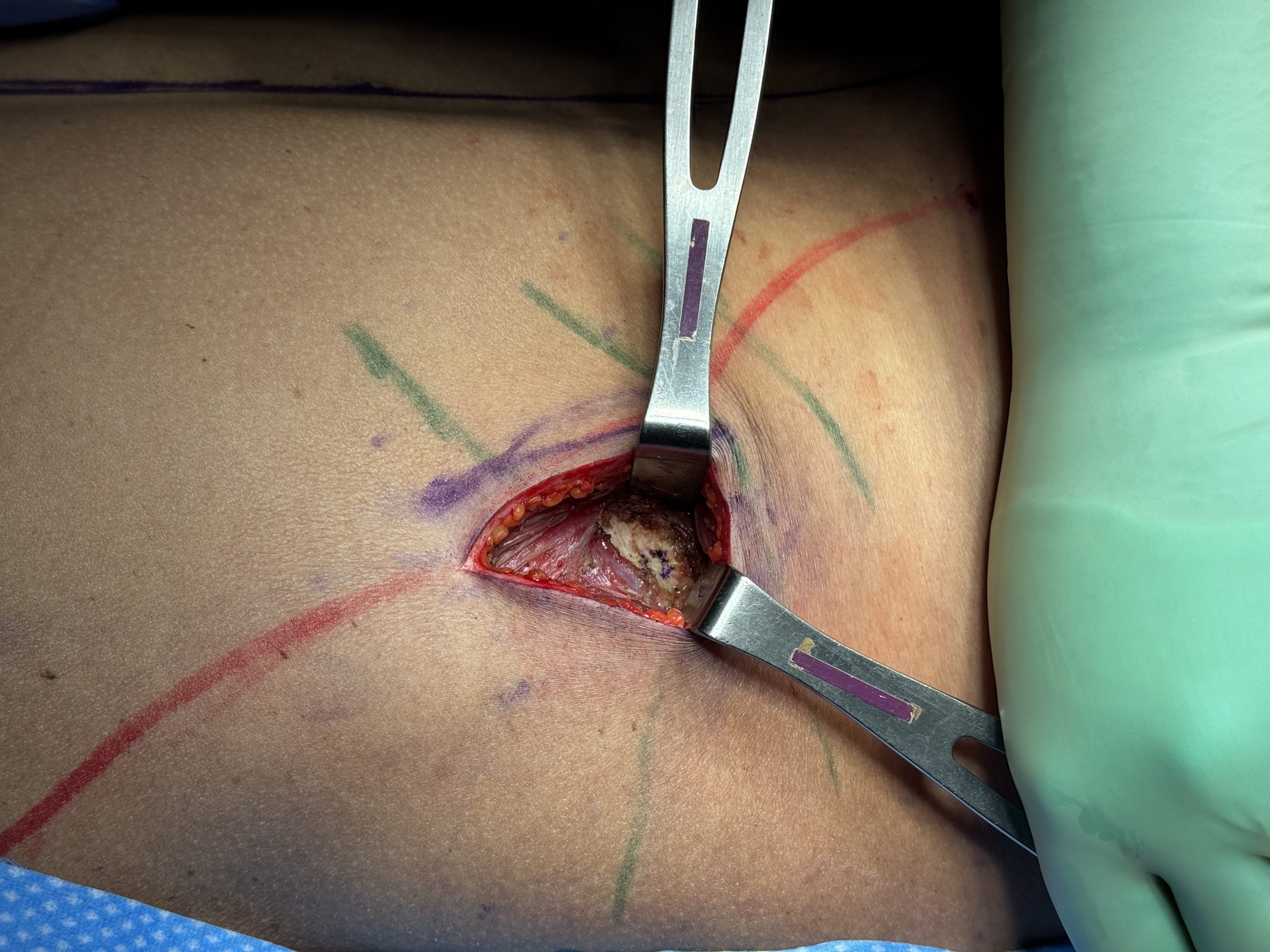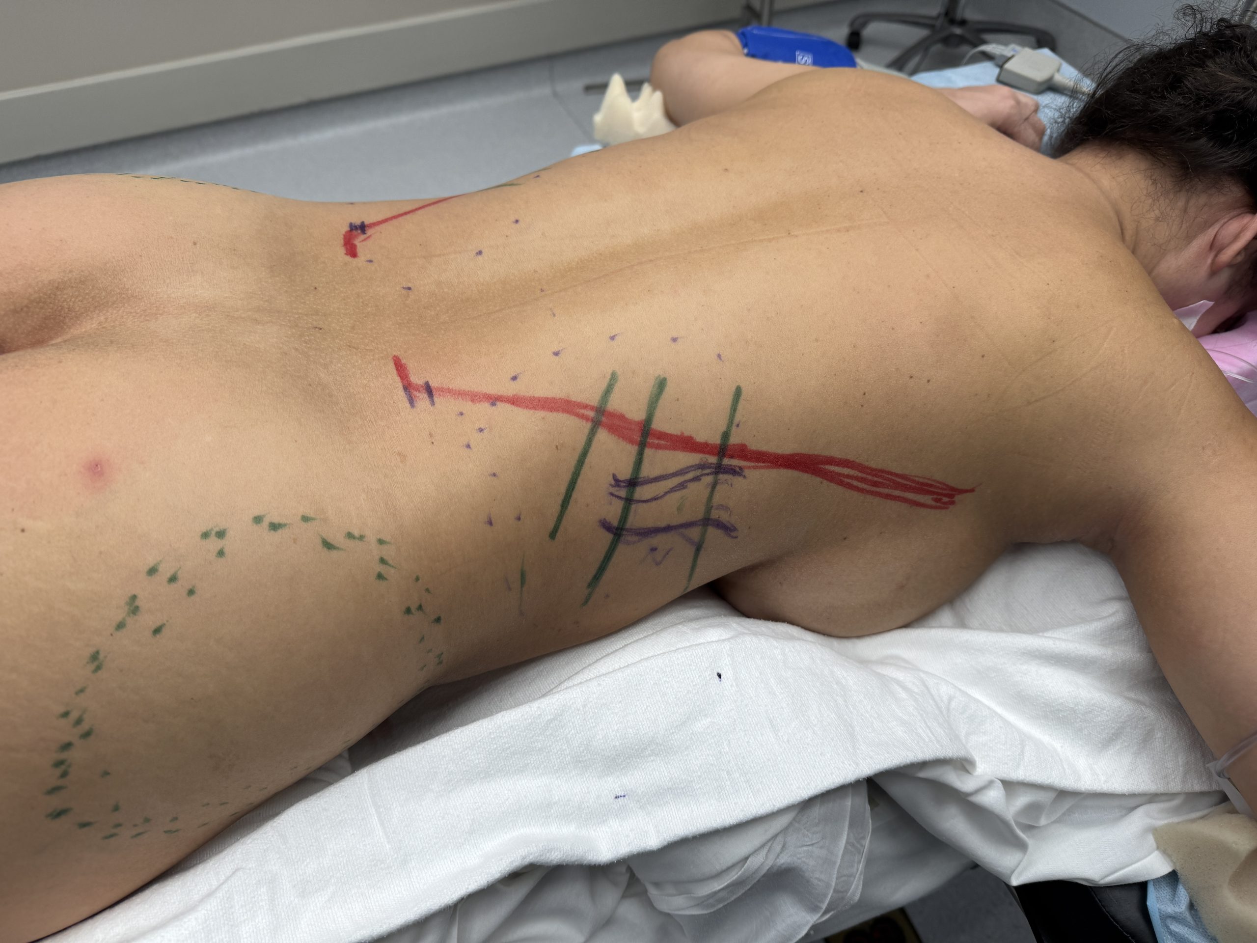 The use of her existing midline back scar from her scoliosis surgery was desired to be used but it was unclear certain beforehand it is could be done. Thus the typical lower oblique back incisions were marked. During surgery there was no problem accessing the ribs through the latissimus dorsi muscle. Ribs #10 and #11 could be removed (subtotal) and the small ends of #12 were also removed. The back skin was also tightened by scar excision like a mini- vertical back lift.